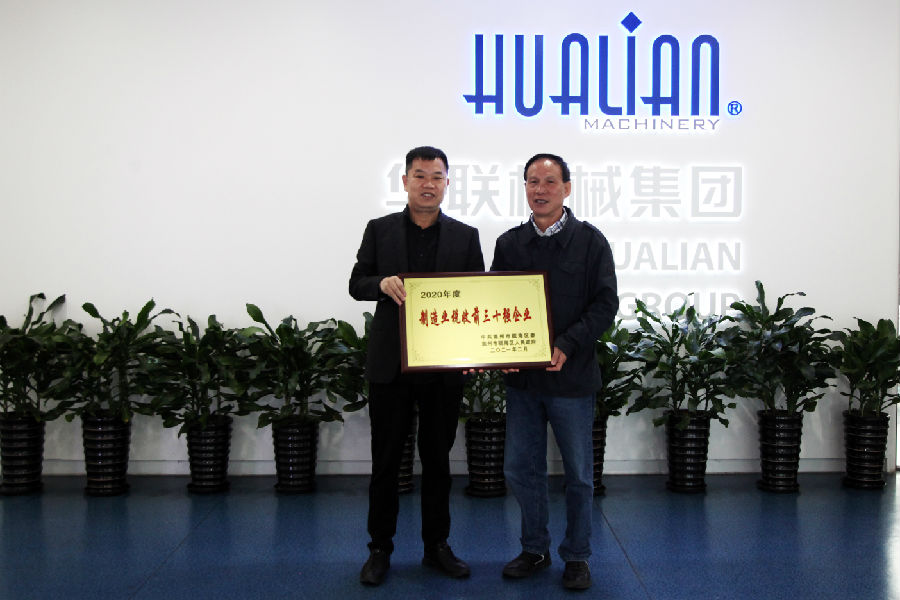 2021年3月31日下午,瓯海区税务局郑副局长一行来访华联机械,并授予中共温州市瓯海区区委与温州市瓯海区人民政府颁发的“制造业税收前30强企业”奖牌。董事长蒋德福接受了授牌,并代表华联机械对郑副局长一行的到来表示热烈欢迎和诚挚感谢。